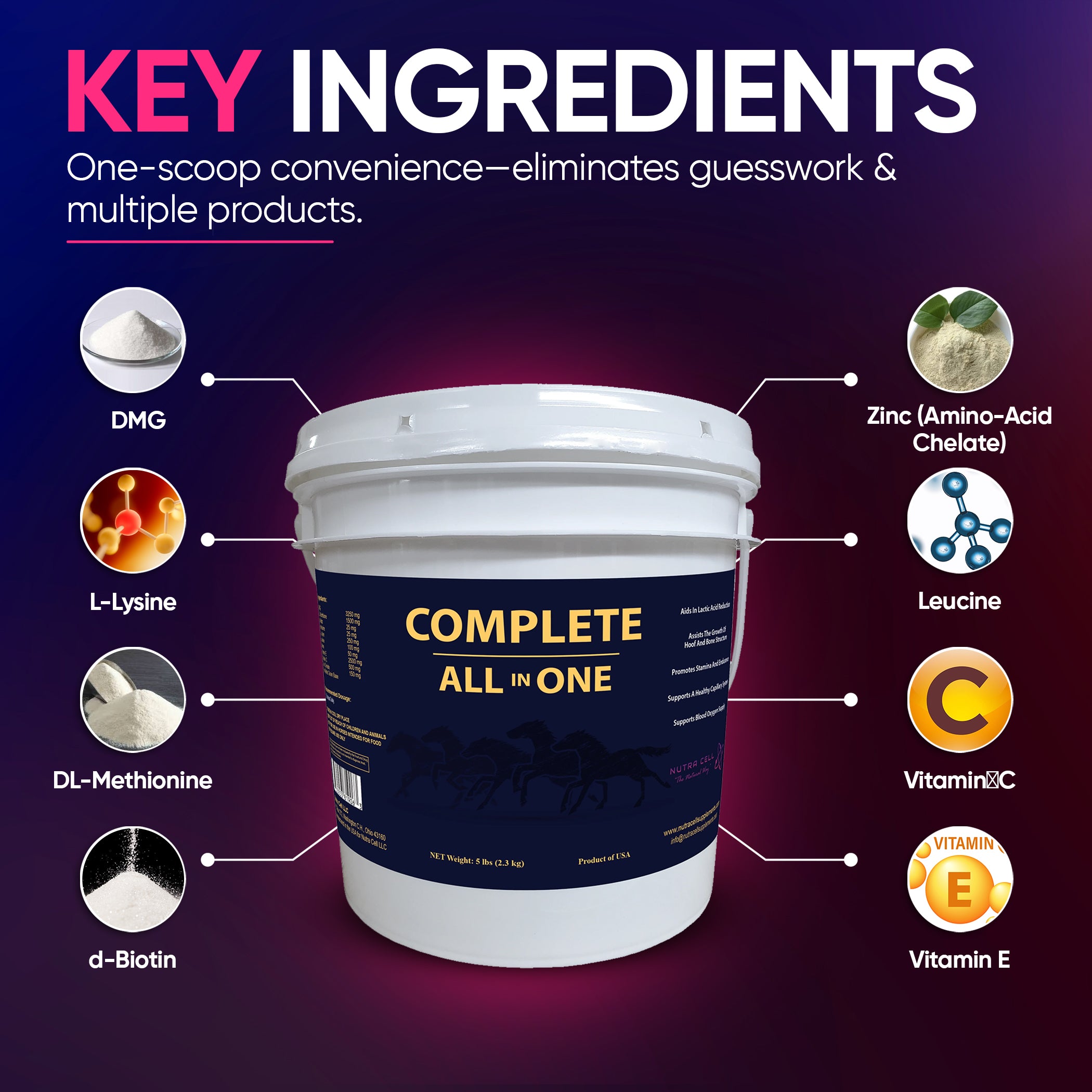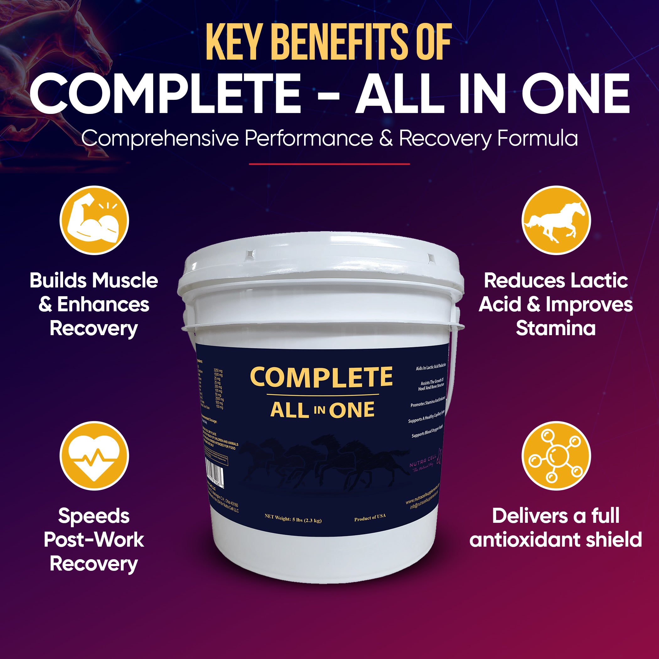 Complete All-in-One daily horse supplement label by Nutra Cell highlighting overall nutrition, joint, gut, and immune health support